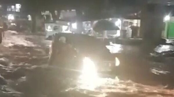 Mobil terjebak di tengah derasnya genangan air di depan Pasar Kamal, Bangkalan, akibat hujan deras yang melanda wilayah tersebut (Foto/Syah)…