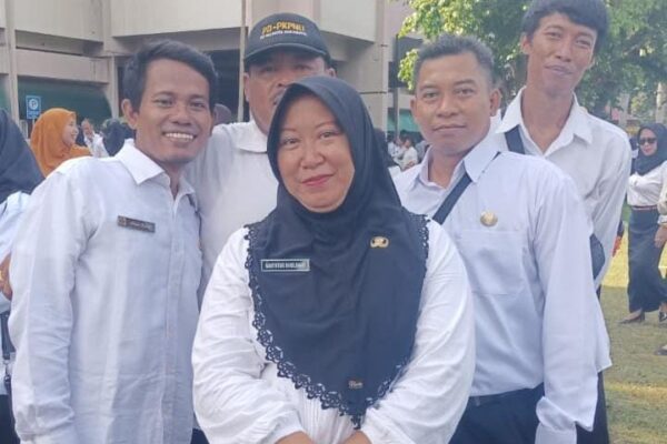Mar’atus Sholihah saat foto bersama dengan rekan sejawatnya yang kini sama sama mengikuti pelantikan PPPK Paruh Waktu di Lapangan Pemkab…